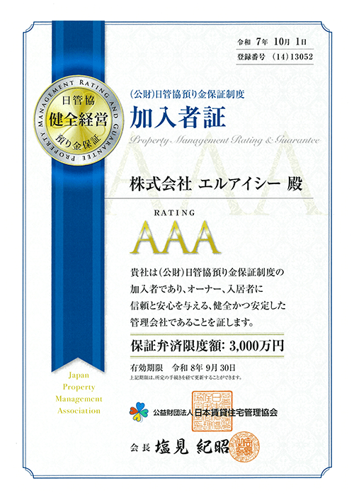 弊社は2012年より継続して公益財団法人日本賃貸住宅管理協会の運営する「日管協預り金保証制度」の加入審査を通過し、本年も継続加入しておリます。