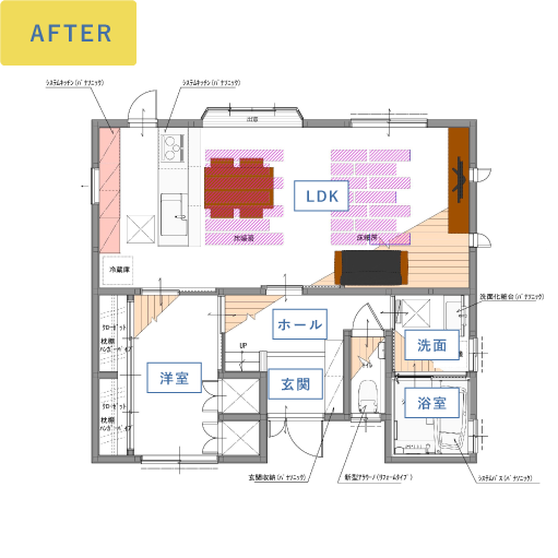 キッチンは「リビングステーションLクラス(チェリー柄)」を採用。建具などもキッチンに合わせたチェリー柄を選定し、統一感がある上、温かみを感じる工夫をされました。また、床暖房を採用したことで、冬の寒さ対策も万全です。